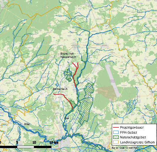 Das Projektgebiet liegt im Landkreis Gifhorn und umfasst die beiden westlichen Zuflüsse der Ise – Beberbach und Bruno mit Hässelbach.